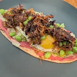 Това ястие е прекрасна комбинация от солени и сладки вкусове, идеално за бърз обяд или лека вечеря. Комбинацията от кремообразен хумус от червено цвекло, пържено яйце и сладко-пикантен карамелизиран лук върху хрупкав плосък хляб е просто неустоима. Това е модерна интерпретация на класическите намазки, която получава вълнуваща текстура и разнообразие от хранителни вещества чрез добавянето на хрупкава салата и пресни зърна едамаме. Истинско вкусово изживяване, което ще харесаш!
