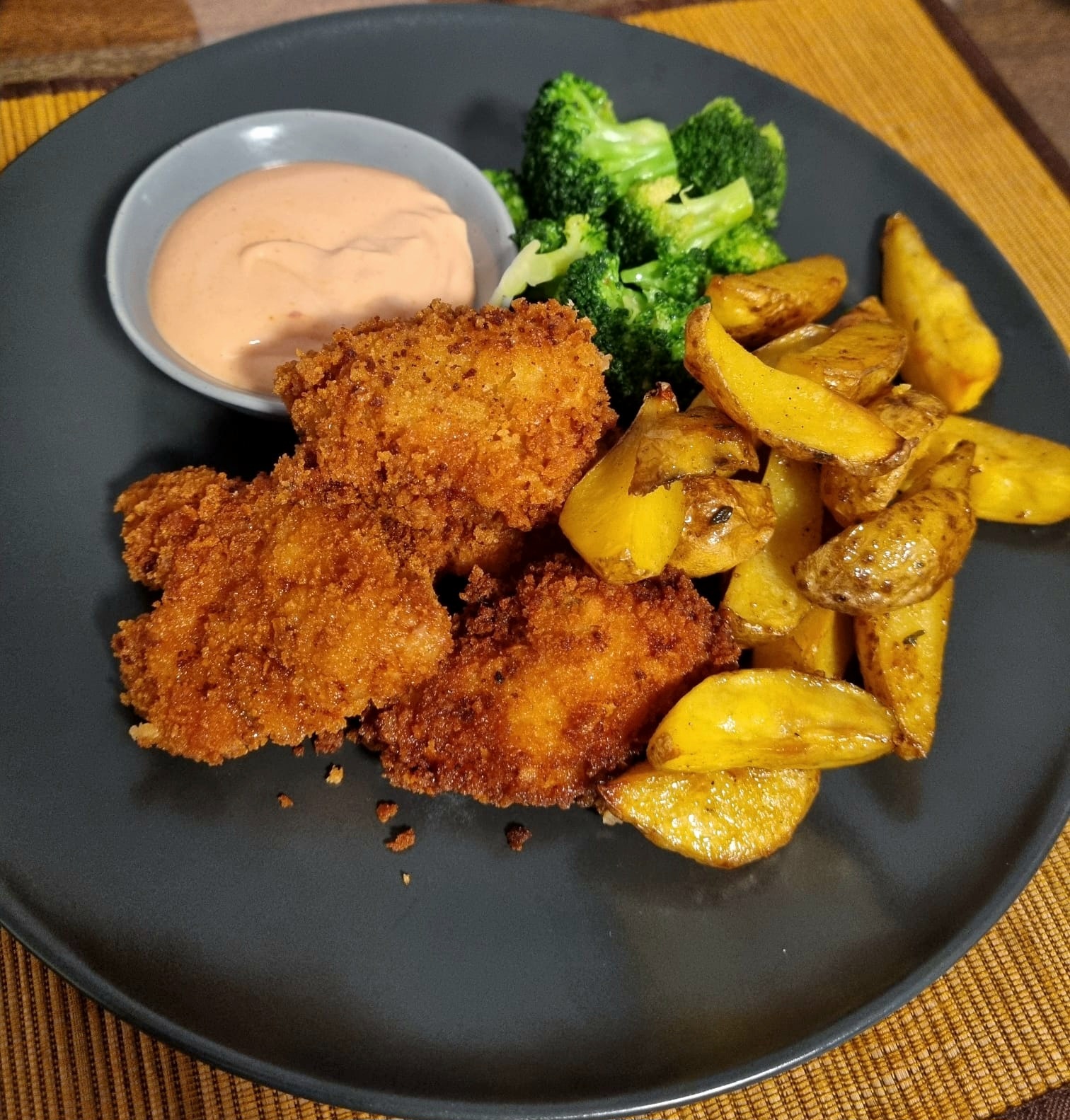 Für den Dip: Die Mayonaise und Ketchup mit dem Cayennepfeffer mischen. Die Zitrone schneiden und den Saft einer halben Zitrone hinzufügen. Auf die Seite legen.