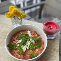 Een snel en makkelijk vegetarisch gerecht met verkruimelde tofu en Bulgaarse witte kaas, gesudderd in een smaakvolle tomatensaus met ui, gegrilde paprika en knoflook.