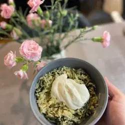 Gib den Spinat und die Butter zusammen mit der weichen Zwiebel in den Topf. Würze großzügig mit Salz und schwarzem Pfeffer.