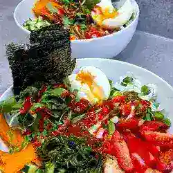 Bringe einen kleinen Topf Wasser zum Kochen. Lege die Eier vorsichtig in das kochende Wasser und koche sie 6-7 Minuten lang für ein perfekt weichgekochtes Ei. Sobald sie fertig sind, gibst du sie sofort in ein Eisbad, um den Garvorgang zu stoppen. Schäle sie vorsichtig, wenn sie kühl genug sind, um sie anzufassen.