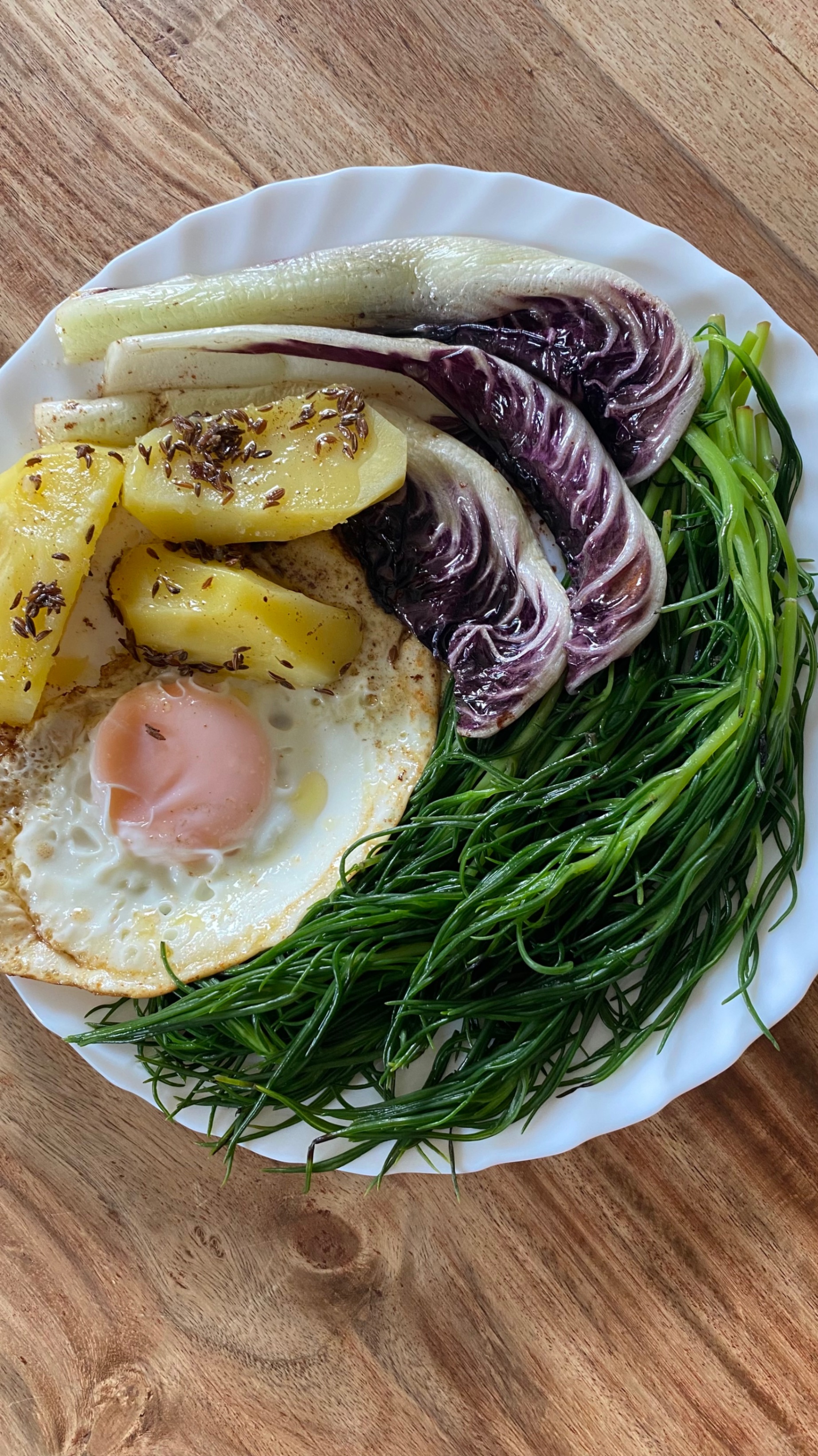 Ein einfaches und leckeres Gericht mit Mönchsbart, gekochten Kümmelkartoffeln, Spiegelei und angebratenem Radicchio. Perfekt für ein schnelles Abendessen.