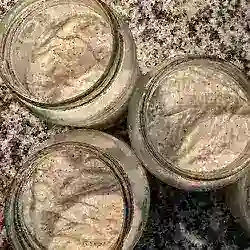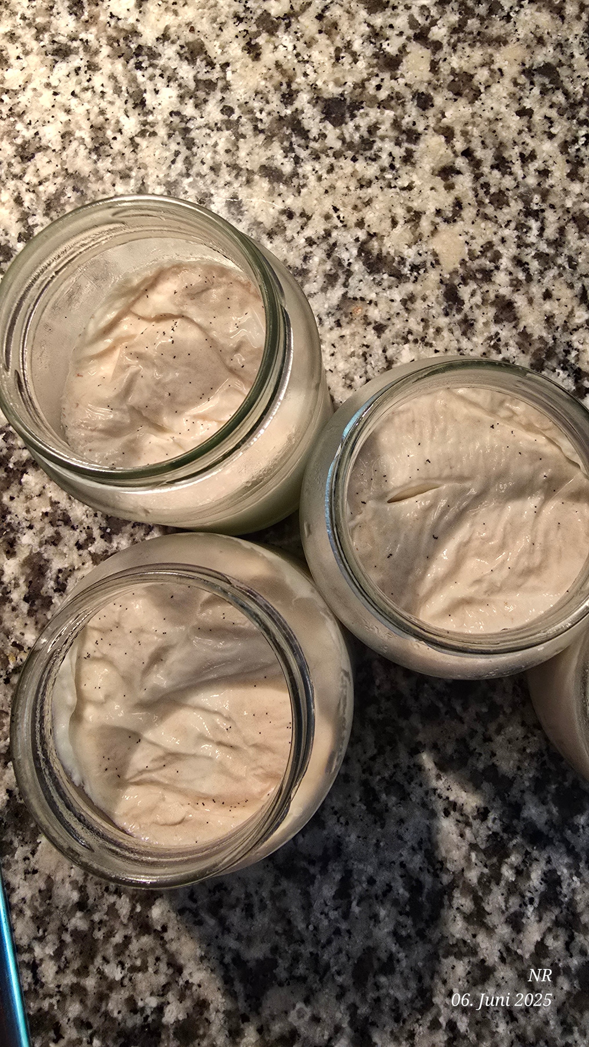 Nimm den Topf vom Herd und seihe die Milch ab, um die Vanilleschote und eventuelle Häutchen zu entfernen. Lasse die Milch auf etwa 50°C abkühlen. Du kannst ein Thermometer verwenden oder einen Finger hineinhalten: Wenn du ihn etwa 5 Sekunden lang halten kannst, ohne dich zu verbrennen, ist die Temperatur richtig.