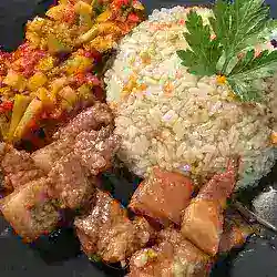 Wasche den Schweinebauch gründlich unter kaltem Wasser und tupfe ihn trocken. Schneide ihn dann in grobe, mundgerechte Stücke und gib diese in eine Schüssel.