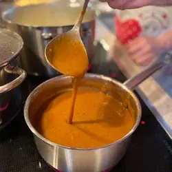 Püriere mit einem Stabmixer alles, was im Topf verbleibt, bis du eine glatte, samtige Konsistenz erhältst.