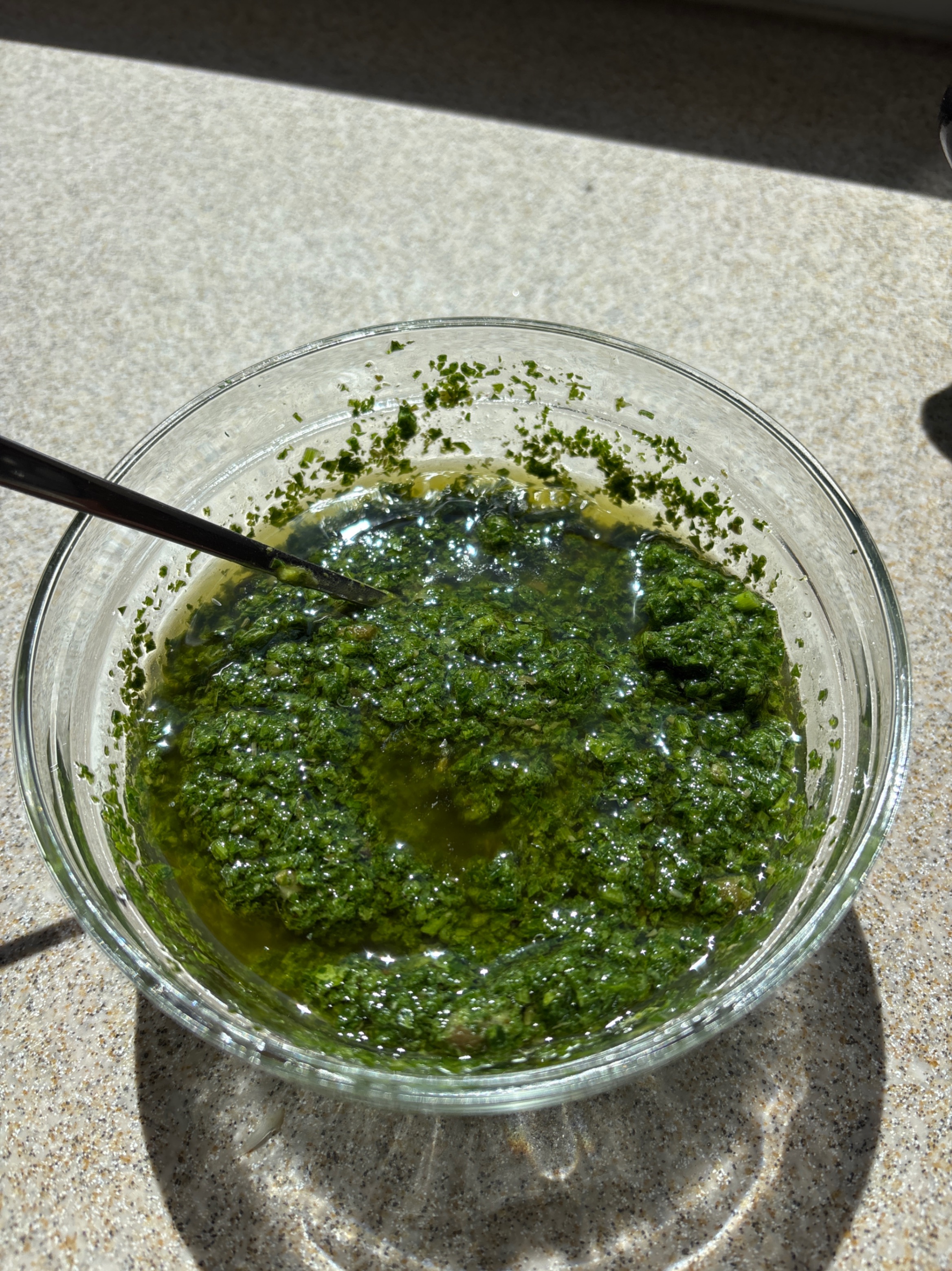 Cut a handful of parsley in very thin pieces. . The same with a TS of capers. All together and ad a TS of mustard, salt, pepper and 50 ml olive oil and 1 lemon. Done