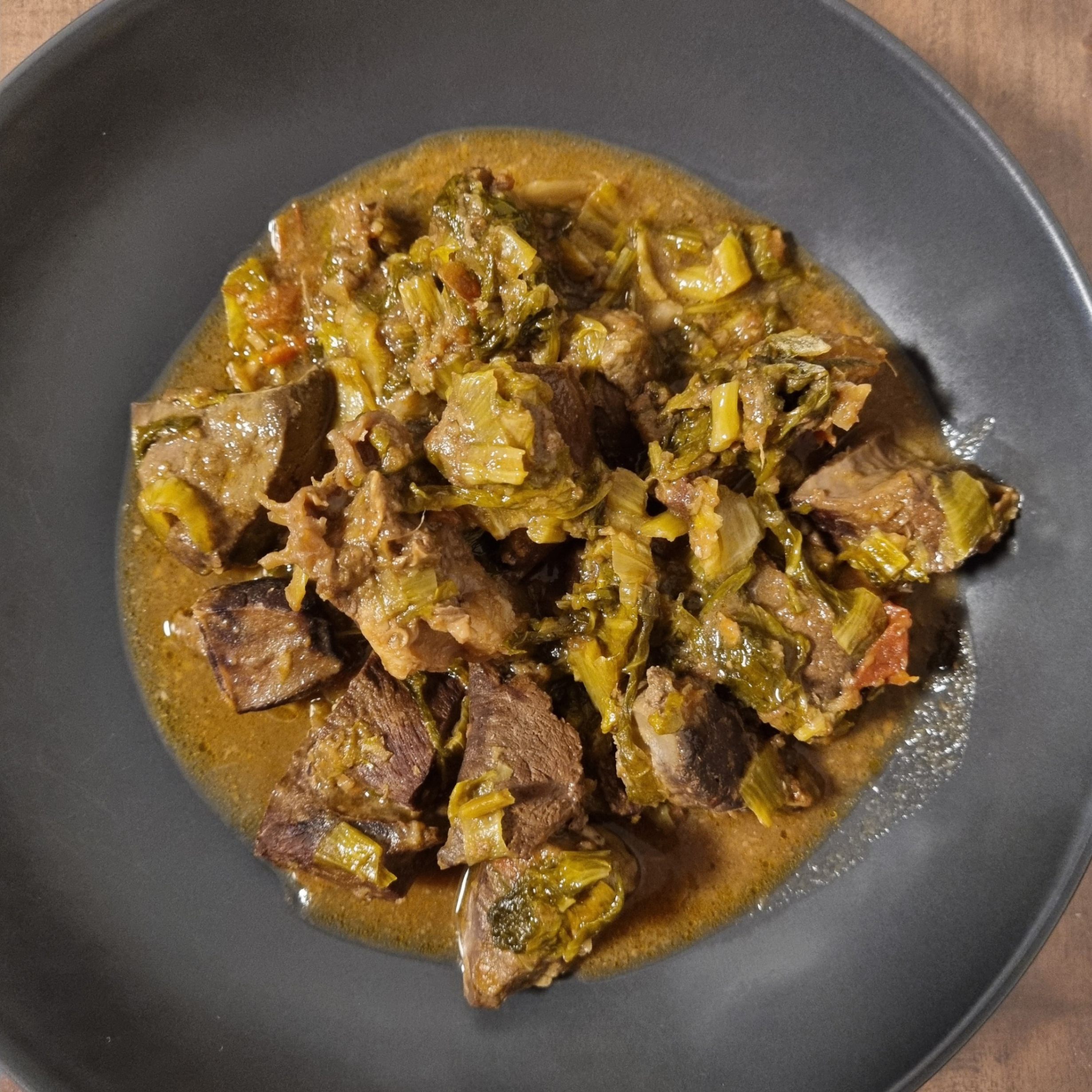 Wash the green mustard greens thoroughly and cut them into smaller pieces.