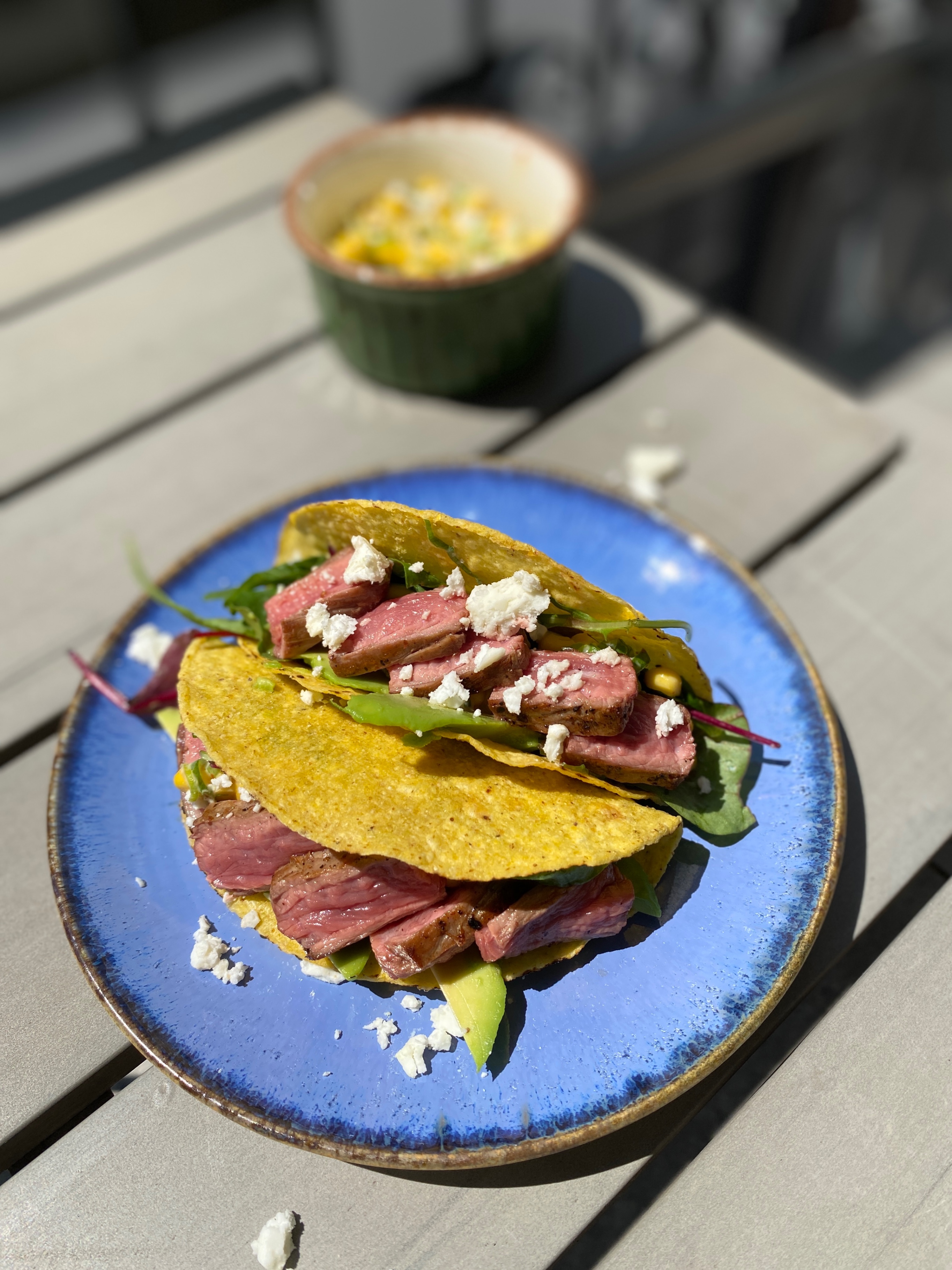 Savor these delicious Beef Tacos featuring perfectly cooked steak, a vibrant street corn salad, and creamy avocado, all nestled in store-bought taco shells. A fantastic meal for any day!