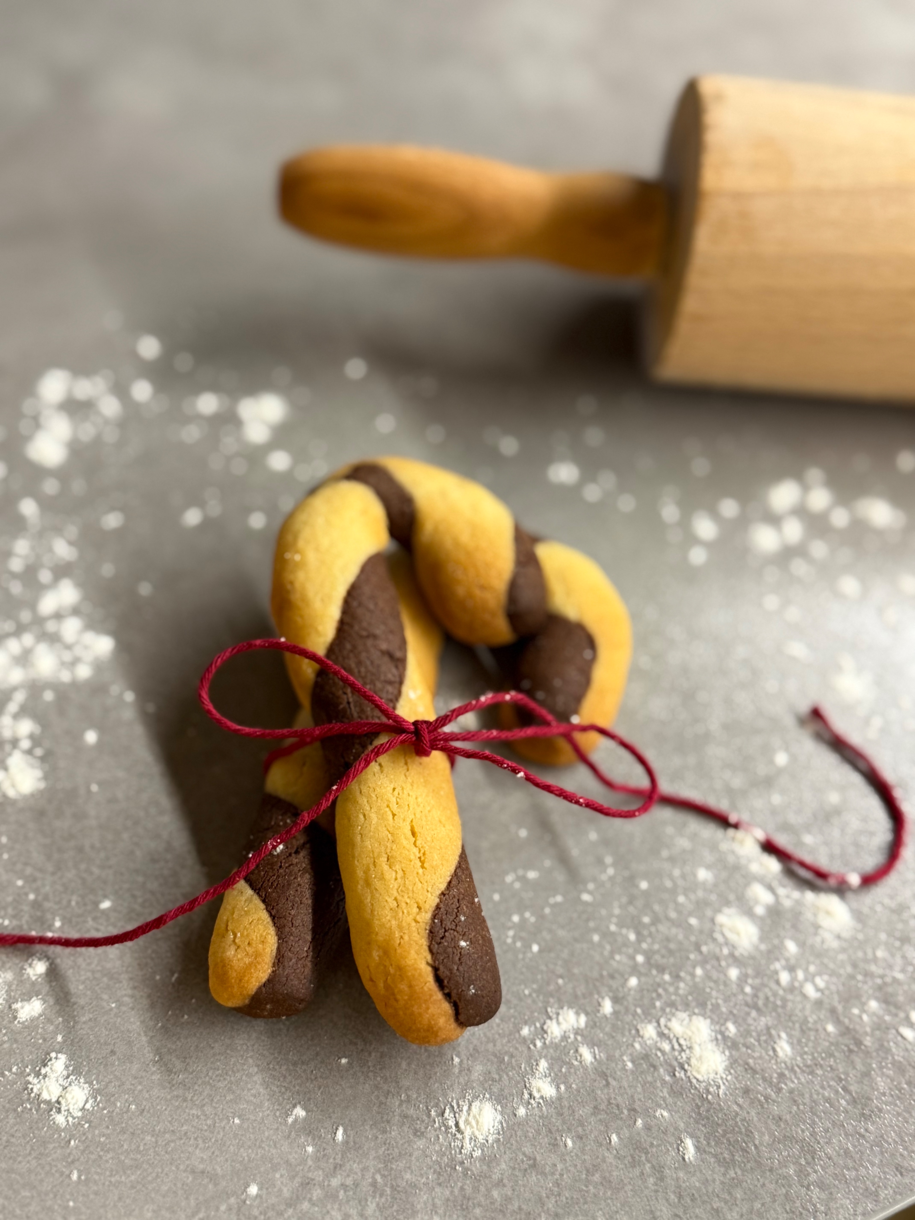 Shape the twisted ropes into small cane-like sticks and place them on a baking tray lined with baking parchment.