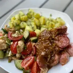 A satisfying and rustic Italian-inspired meal. This dish features juicy sausages seared in their own juices, paired with buttery, herb-tossed potatoes and a bright, refreshing cucumber and tomato salad with fresh mozzarella di bufala.