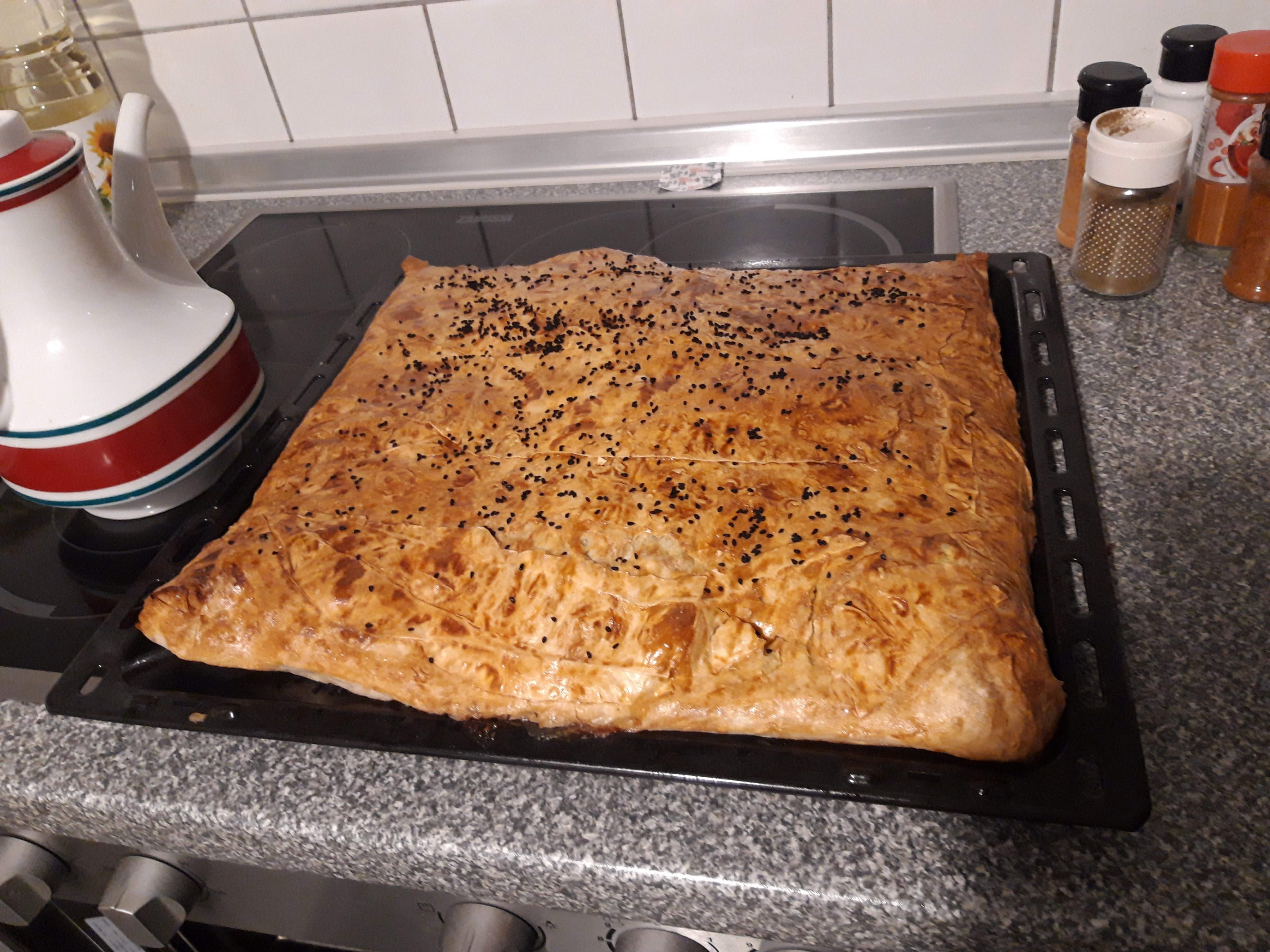Después de la última capa de relleno, pon otra vez Yufka (para que todo quede cubierto) y salsa por encima.