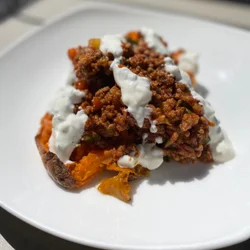 Eleva tu rutina de cena con estas batatas rellenas que presentan un ragú de carne rico y especiado y una salsa de hierbas fresca y cremosa. Esta comida rica en proteínas combina la dulzura natural de las batatas asadas con un toque de chocolate para un perfil de sabor profundo y complejo.