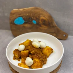 Меки ньоки в богат, плътен сос рагу, гарнирани с кремообразна моцарела ди буфала и пресен босилек.
