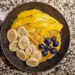 Geniet van deze superlekkere Gele pap met mango, banaan en bosbessen. Een perfecte start van de dag!