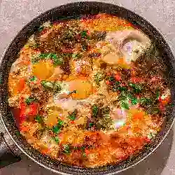 Szakszuka: Aromatyczne i żywe danie bliskowschodnie z jajkami w koszulkach w bogatym sosie pomidorowym i z pieczonej papryki, z dodatkiem czosnku niedźwiedziego i udekorowane fetą i natką pietruszki.