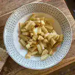 Przełóż ciepłe kawałki selera korzeniowego do miski do serwowania.